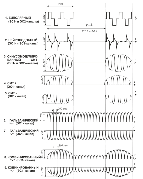 • физиотерапевтические токи: прямоугольные биполярные, синусномодулированные,  нейроподобные, гальванические.