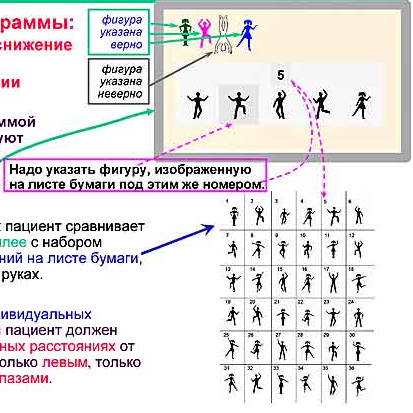 Во всех упражнениях пациент сравнивает изображение на дисплее с набором эталонных изображений на листе бумаги, который он держит в руках.