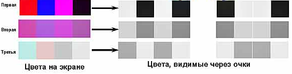 Для разделения левого и правого полей зрения используются красно-синие очки