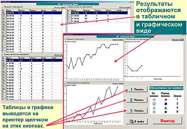 Программа позволяет варьировать параметры упражнений в широких пределах: для слабовидящих детей и детей с нормальной остротой зрения.