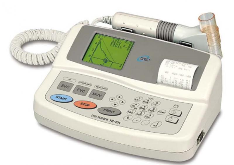 - CHESTGRAPH HI-101- компактный прибор cLCDдисплеем, высокоскоростным термопринтером, датчиком потока, интерфейсом RS-232 для передачи данных на компьютер и встроенной аккумуляторной батареей, автоматически заряжаемой при каждом включении прибора к сети.