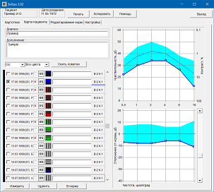 Имеется картотека пациентов, и результатов измерений. Для удобства выбора нужных данных предусмотрены сортировки по фамилии, диагнозу, дате и т.п. На графиках отображается до 4 кривых, что удобно для прослеживания динамики или для сравнения сохранности контрастной чувствительности по разным цветам. При печати используются цветовые возможности принтера.